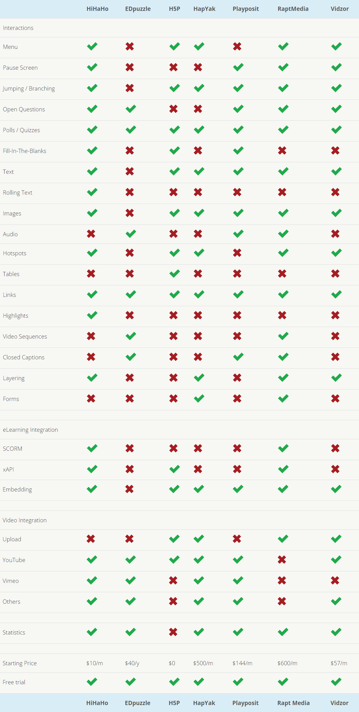 In the table, you can find a list of eight major interactive video tools that you can use for elearning. We compare them based on several criteria. Our main criterion for selecting these tools was that they should specialize in online learning.