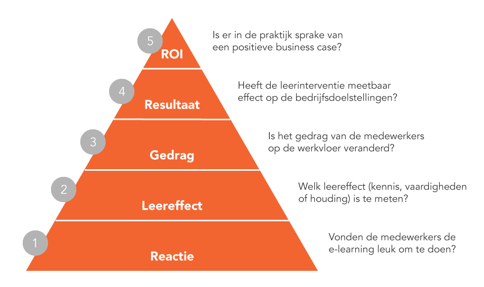 Er zijn verschillende niveaus waarop je het resultaat van leerinterventies kunt evalueren en meten. Het evaluatiemodel van KirkPatrick met 4 niveaus is toch wel de bekendste methode. Philips heeft hier een 5e niveau ‘Return on Investment’ (ROI) aan toegevoegd. Hierbij voegt hij het financiële plaatje toe: Wat levert de interventie op ten opzichte van de hoeveel geld en tijd die erin is gestoken?
