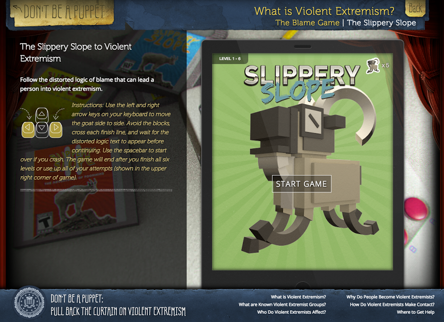 Ok, dus we hebben een geit. En die rent. Hard. Tussen van die gekleurde blokken. Tot hij bij de finish is. Nu moeten we nog iets met extremisme. We gingen ze wat van die spreuken leren. Die verschijnen dan gewoon in beeld als je over de finish komt. Makkelijk zat.