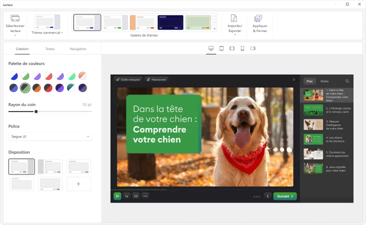 Met de vooraf ingestelde thema's kunt u uw presentatie in enkele minuten omtoveren tot een aantrekkelijke online cursus. Dankzij de ruime collectie van vooraf ingestelde thema's kunt u elk van deze thema's onmiddellijk op uw hele cursus toepassen. Of, als u uw eigen favoriete kleurencombinatie heeft, kunt u deze opslaan voor verder gebruik, zonder dat u deze elke keer handmatig opnieuw hoeft in te stellen.