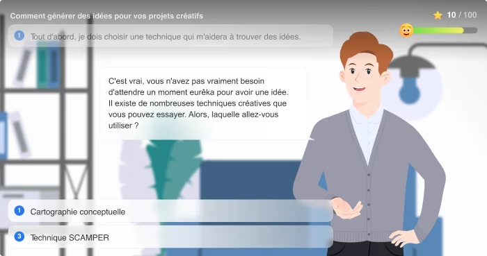 Personages dompelen uw studenten onder in de context van het leren en vergemakkelijken hun kennismaking met het onderwerp. Handgetekende illustraties weerspiegelen verschillende menselijke emoties en maken zo het cursusmateriaal toegankelijker. Er zijn gestileerde achtergronden zoals een receptie of een bureau, om studenten door de cursus te leiden en een interactief rollenspel te doen met verschillende uitkomsten, afhankelijk van het antwoord.