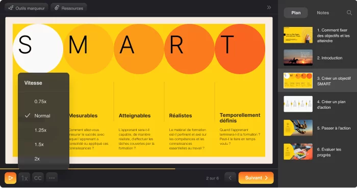 iSpring Suite 11 geeft studenten de mogelijkheid om het afspeelproces aan te passen op een manier die het beste bij hen past. Leerlingen kunnen kiezen tussen donkere of lichte kleurthema's om de lichtheid aan te passen, en animaties, effecten en video's versnellen of vertragen, net als bij YouTube. Deze benadering, waarbij de student centraal staat, maakt het online volgen van cursussen nog beter.