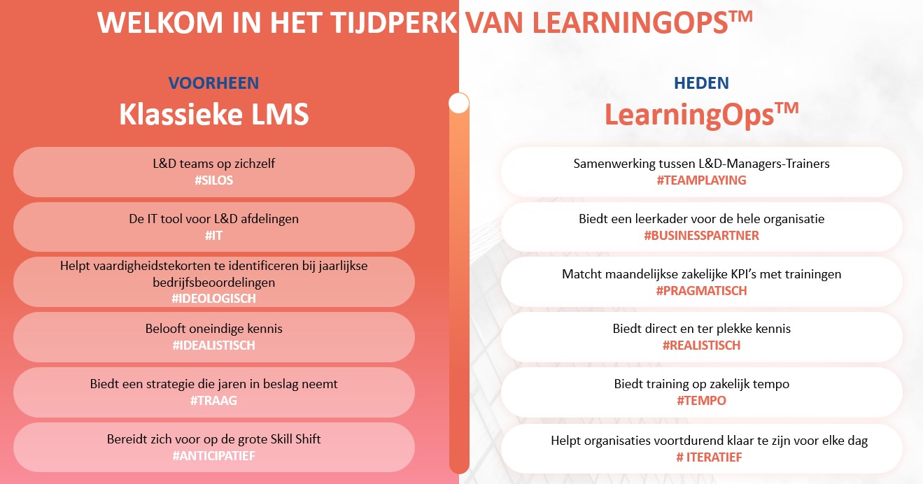 LearningOps™ stelt organisaties in staat om synchroon te lopen met de business, elk talent zijn eigen leerprogramma te geven, training onderdeel te maken van de dagelijkse werkroutines van teams, snel en eenvoudig schaalbare content te creëren voor alle cursisten en te profiteren van ondersteuning voor succes. Deze nieuwe benadering van leren creëert een winnende relatie tussen L&D, cursisten en management, levert een leerkader voor de hele organisatie, koppelt maandelijkse zakelijke KPI's aan training, biedt onmiddellijke en on-the-spot knowhow, levert training op zakelijke snelheid en helpt organisaties voortdurend klaar te zijn voor elke dag.
